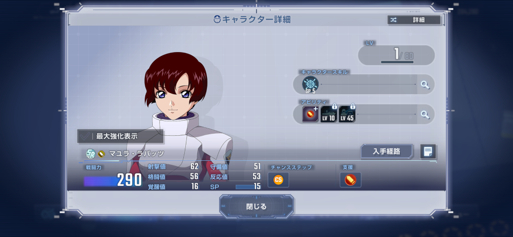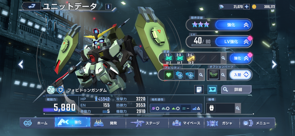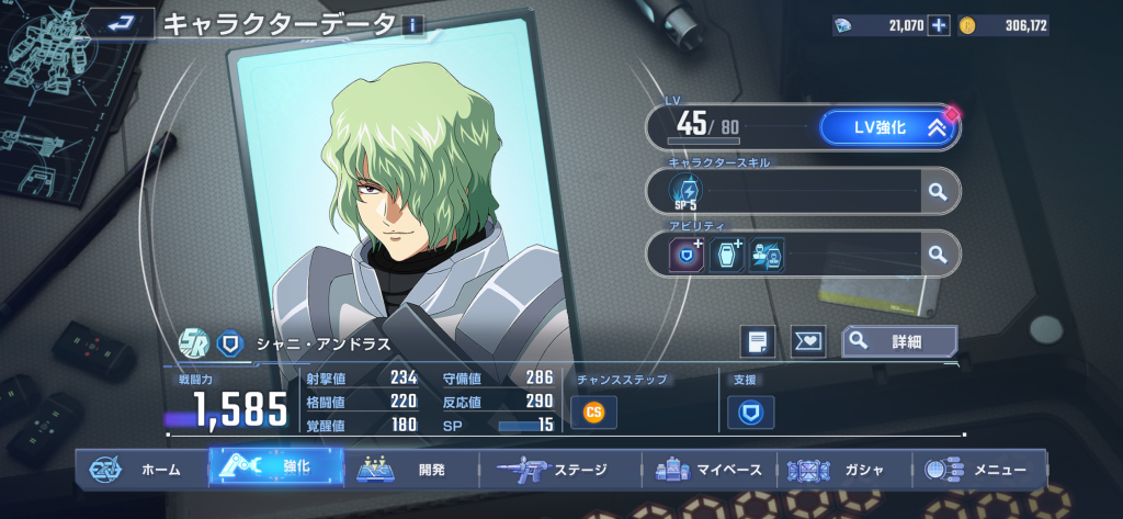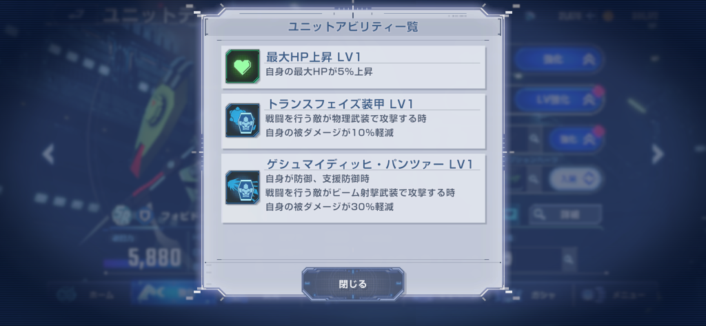 物理ダメージ10%、ビーム射撃ダメージ30%軽減できるユニットアビリティが優秀です。SRなので簡単に完凸できます。原作アニメ内でもビーム攻撃をフニャンフニャンと曲げてかわしていましたね。